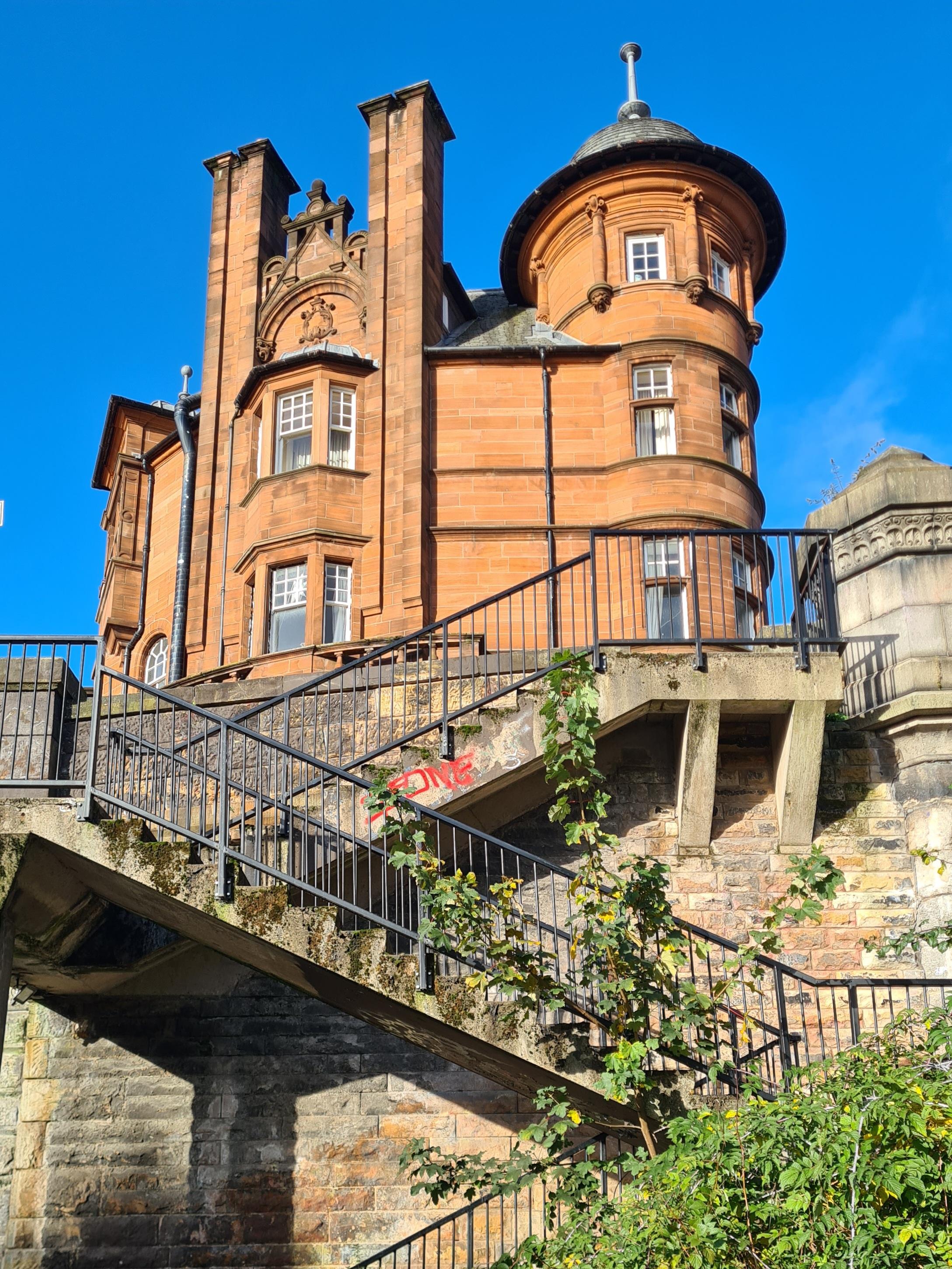 Looking up at Caledonian Mansions on Great Western Road from the walkway along the River Kelvin in Glasgow. Designed by James Miller in a Free Arts and Crafts/Glasgow Style, it was built in the 1890s for the Caledonian Railway Company.